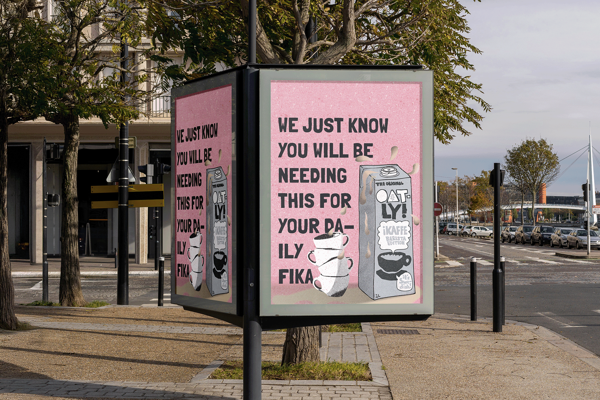 The purpose of the student project was to design for the OATLY brand through various digital platforms, including physical banners, billboards, and social media carousels, to create motion design content by reminding consumers that Oatly is an excellent choice for a Swedish "fika" or coffee break.